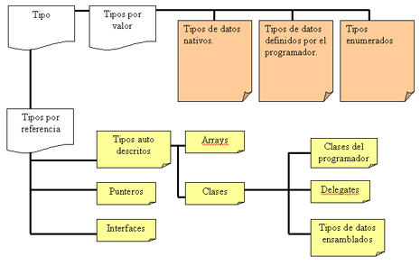 Tipos por valor: los tipos por valor almacenan datos a los que se puede acceder de forma directa, a su vez dentro de esta categoría encontramos mas subcategorías como los tipos nativos de .NET, los tipos de datos creados por el programador y los enumerados. Los tipos por valor no pueden tener valores nulos.