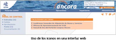 - Como elementos gráficos en los documentos y en las páginas web. Los iconos aquí sirven para identificar secciones, situar puntos visuales interactivos, ampliar la información de enlaces textuales a los que acompañan, etc.