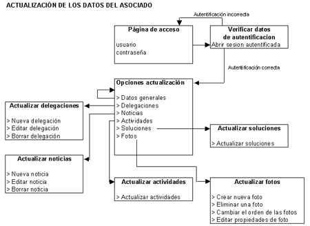 Por medio de un usuario y password, que serán asignados para cada asociado por la asociación, se podrá acceder el área de actualización de sus datos. Además, en todas las páginas que permitan editar los datos se comprobará que el usuario se ha autentificado correctamente, para evitar posibles accesos no permitidos.