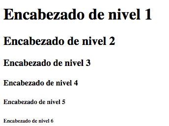 Hay varios tipos de encabezados, que se diferencian visualmente en el tamaño de la letra que utilizan. La etiqueta en concreto es la H1, para los encabezados más grandes, H2 para los de segundo nivel y así hasta H6 que es el encabezado más pequeño. Pero lo importante, insistimos es la estructura que denotan. Una página tendrá generalmente un encabezado de nivel 1 y dentro varios de nivel 2. Luego, dentro de los H2 encontraremos si acaso H3, etc. Nunca debemos usar los encabezados porque nos formateen el texto de una manera dada, sino porque nuestro documento lo requiera según su estructura.