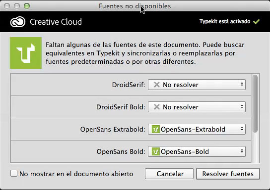 También existe la posibilidad de que cuando abrimos un documento, si incluye una serie de tipografías que nosotros no disponemos, se abre una ventana como la que mostramos a continuación: