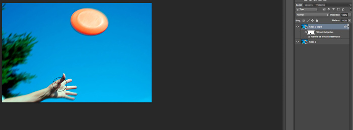 La segunda opción sería, antes de empezar con el desenfoque, crear un duplicado de la capa inteligente, realizar un primer trazado al frisbee y posteriormente en la máscara de capa pintar de negro con un pincel mediano con el contorno difuminado para ir recuperando la parte de imagen de debajo que se encuentra enfocada.