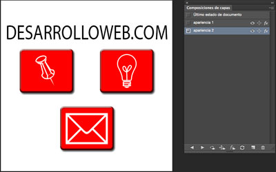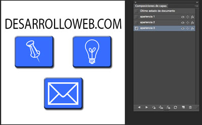 Por ejemplo, nos puede interesar tener distintas opciones en las que se visualicen todos o algunos botones de un diseño, de esta forma podemos crear distintas composiciones que nos muestren en cada una los botones deseados, aplicando algunas opciones. Gracias a ello ya no tenemos ir a las capas de botones y activarlos o desactivarlos manualmente.