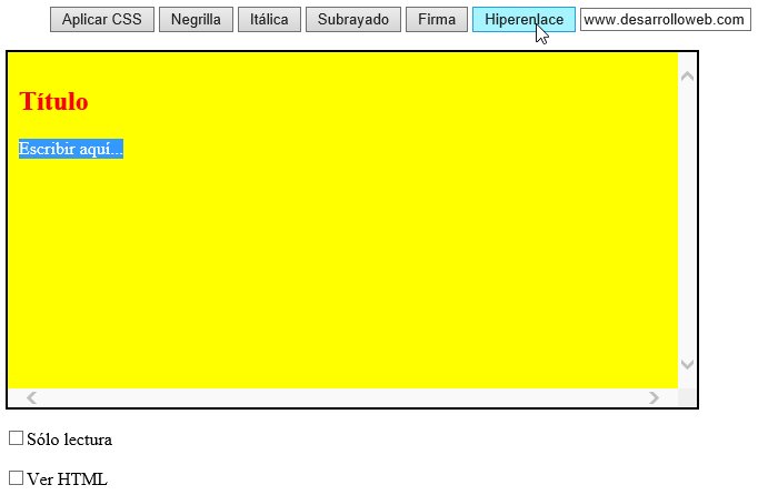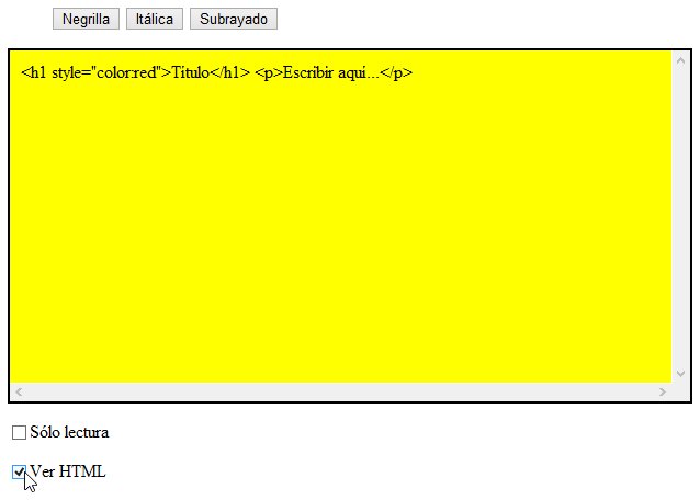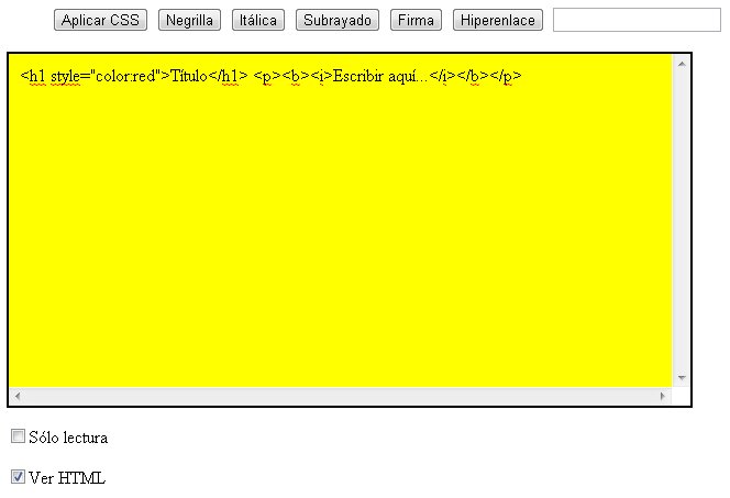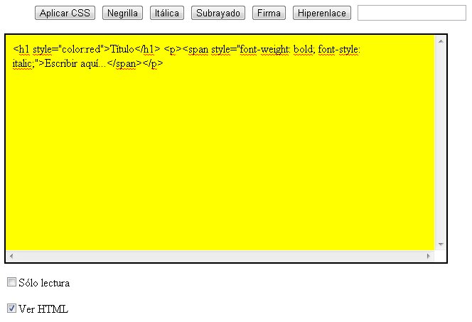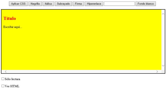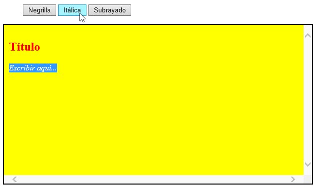 Aquí ilustramos un ejemplo de uso de estilos sobre el área de edición, mediante funciones generales de JavaScript, una alternativa al uso de execCommand para algunas de las opciones disponibles.En la siguiente porción de código, se cambiará el color de fondo del área de texto enriquecido –contentEditable- mediante un simple botón de comando: