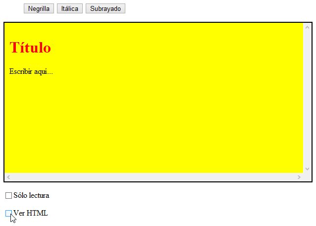 - Cuando su estado cambia, "onChange" se activa o desactiva la edición según sea el estado de selección, this.checked, de la casilla de verificación, pasándolo como parámetro a execCommand