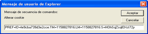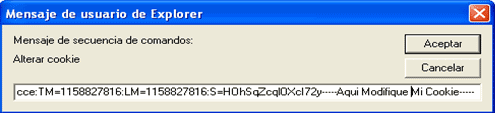 Como podemos observar allí se encuentra nuestra cookie en un cuadro de dialogo que a la vez nos permite modificarla, así que haremos click al final de la cookie y agregaremos un texto a ver si la modifica y presionamos el botón aceptar del cuadro de dialogo, como el script aun esta en el navegador simplemente volveremos a presionar la tecla ENTER o haremos click sobre el botón IR y veremos nuevamente el cuadro de dialogo.