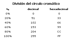 Esta división del círculo se corresponde con 6 tonos de rojo, 6 de azul y 6 de verde, a partir de los cuales se obtienen, por mezcla entre ellos, los 216 colores posibles, por lo que todos ellos tendrán un código hexadecimal en el que cada color primario viene definido por una pareja de valores iguales, debiendo estos ser 00,33,66,99,CC o FF.