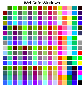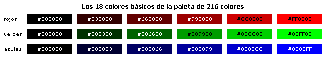 Aquí viene la decepción del diseñador web, ya que este número es en realidad muy bajo. Tradicionalmente se ha considerado como paleta de colores segura la que hemos antes mencionado, formada por los 216 colores del tipo #aabbcc, donde a, b y c deben ser 0,3,6,9,C o F, que recibe el nombre de WebSafe.