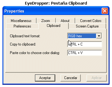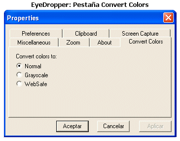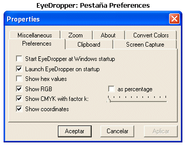 Si pulsamos con el botón derecho del ratón sobre el icono de EyeDropper aparecerá un menú emergente con la opción Properties, que nos llevará a una ventana de configuración con una serie de pestañas, entre las que destacan las siguientes: